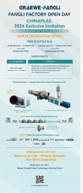 21-24 сәуір аралығында CHINAPLAS 2026 көрмесінде 7.1C14 стендіндегі Fangli Technology компаниясына барыңыз. Пластикалық құбыр жабдықтарындағы инновациялар мен болашақ ынтымақтастықты бірге зерттейік!